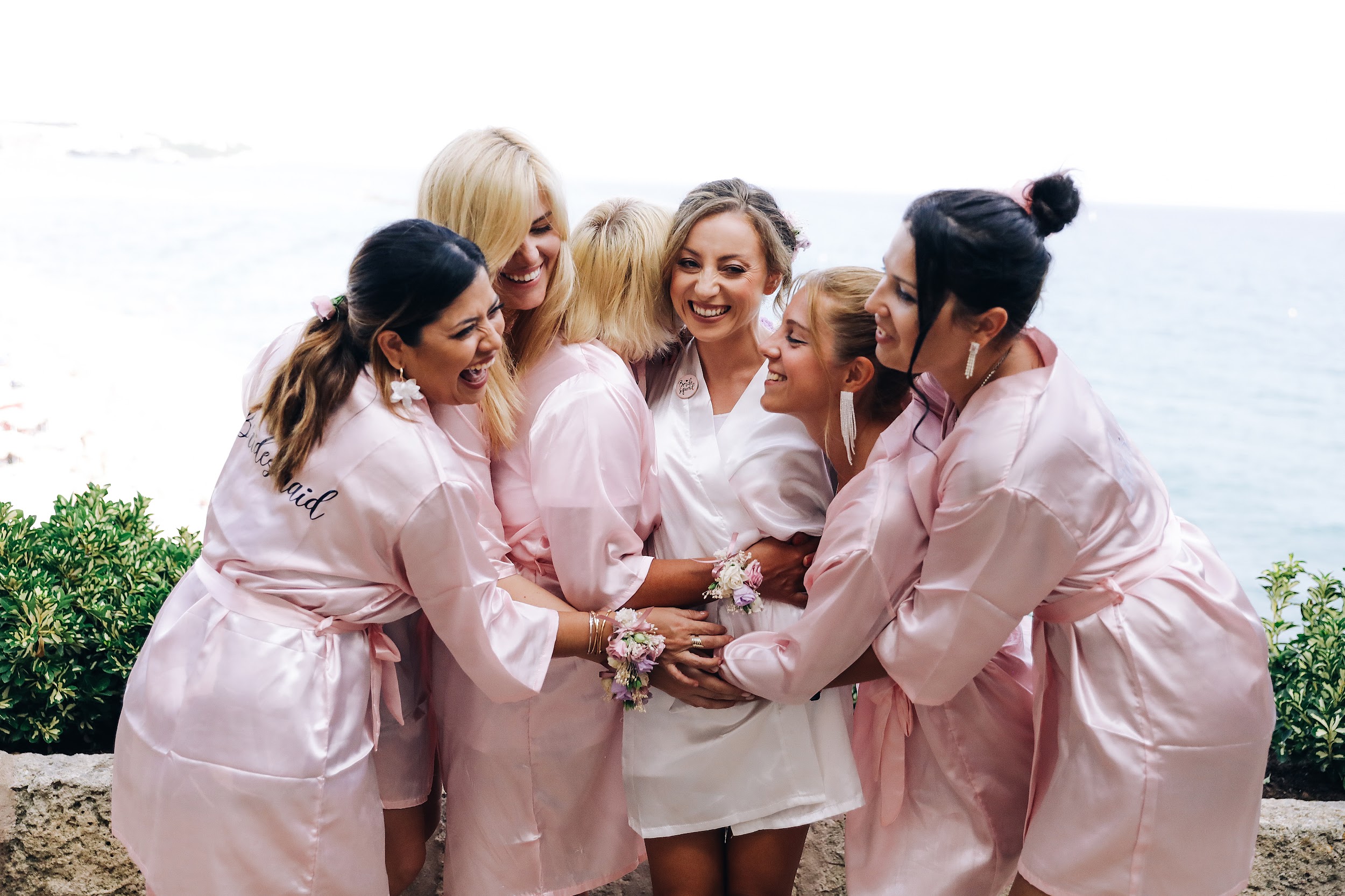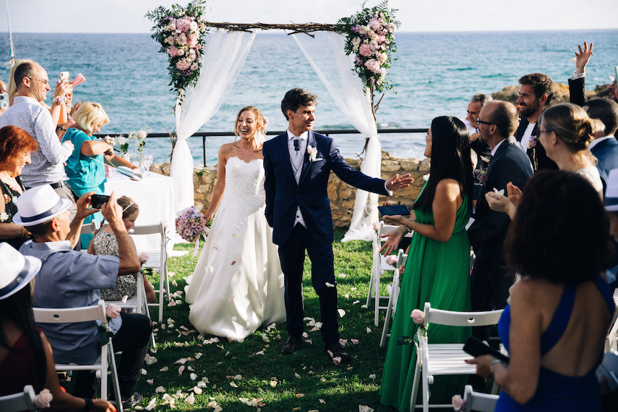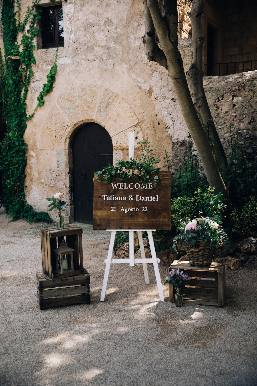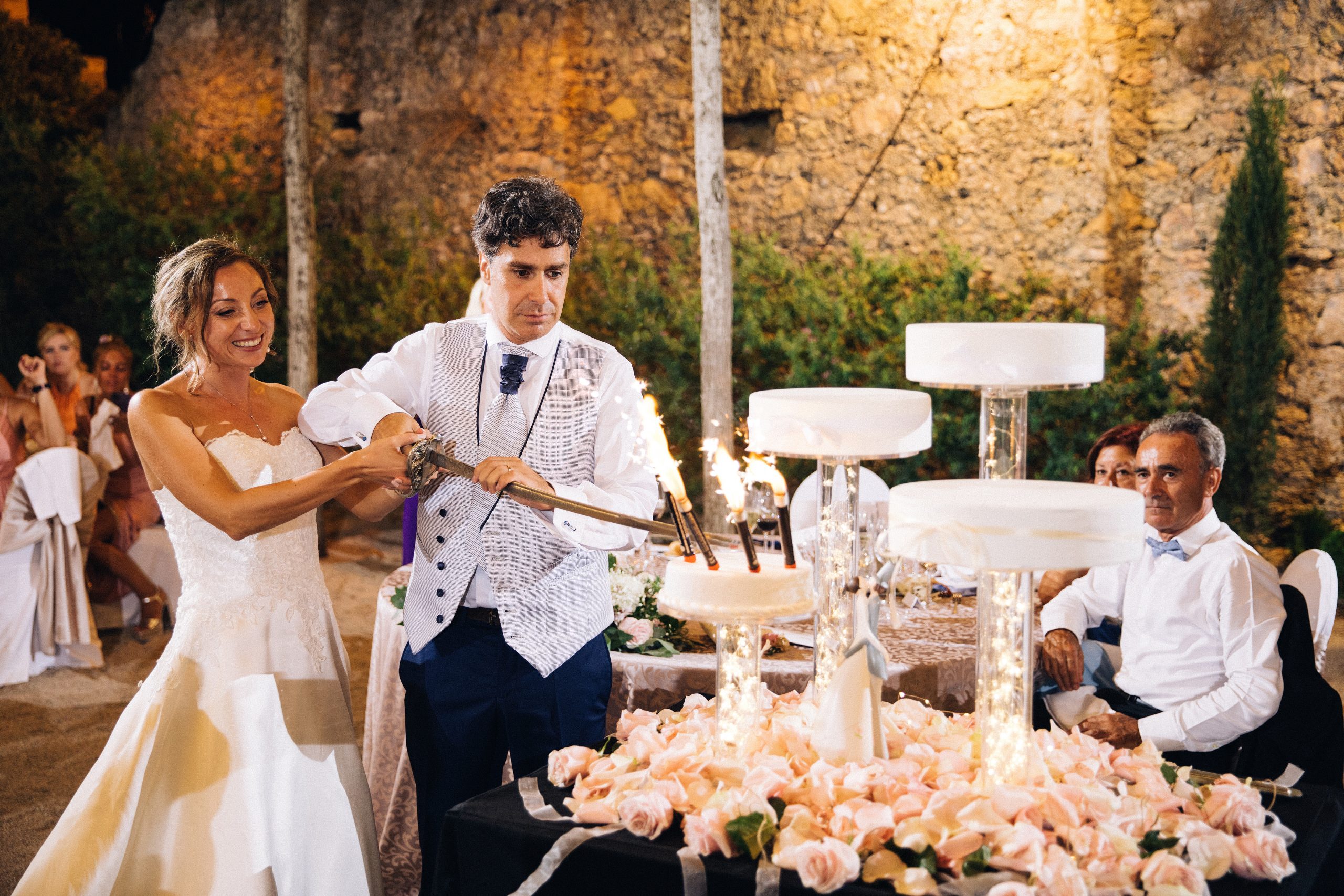 On that wonderful summer day we celebrated the wedding of Tatiana & Daniel at the Tamarit Castle in Tarragona. This is an exclusive venue, a medieval castle with stunning sea views, 80 km from Barcelona. Guests from different parts of the world came to celebrate the wedding on that sunny summer day. The bride was getting ready with her bridesmaids in the castle’s ancient bridal room with a magnificent terrace overlooking the sea, while the groom was preparing in his room on the other side of the castle. Meanwhile, the guests were arriving and enjoying the welcome drinks on the patio. Thirty minutes later, the civil ceremony began at the beautiful arch decorated with fresh flowers overlooking the sea. Following traditions during the ceremony, the couple got married and left for a photoshoot in the magical corners of the castle while the guests enjoyed the cocktail by the pool and live saxophone music. Meanwhile, the showman entertained the guests. At the end of the cocktail party, each guest received an ecological balloon, which had to be released into the sky with the best wishes to the newlyweds. Later, the guests were invited to an outdoor dinner in another part of the castle, decorated with lights and flowers. During dinner, the showman entertained the guests with various cross-cultural quizzes related to the couple, and a dance battle at the end. After the beautiful cake was served, the guests were invited to a disco with a DJ in an indoor hall, where everyone enjoyed open bar and dancing. This wedding was wonderful, organized in advance with great attention to detail as the venue is very demanded. We wish the couple constant love and happiness!